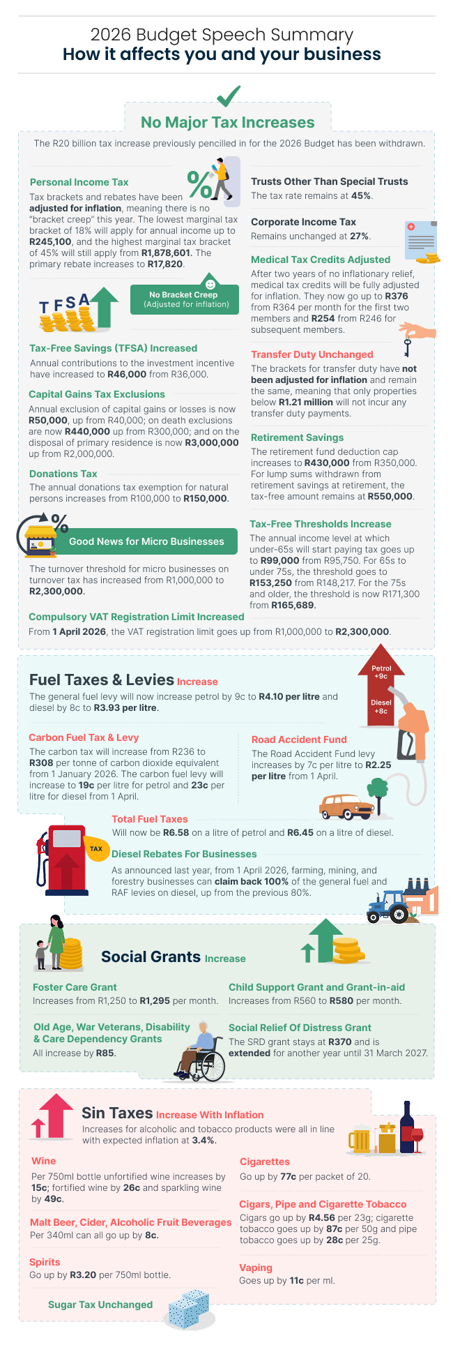SARS has also released an updated version of the “Budget 2026 Tax Pocket Guide” which provides a useful summary of the tax tables and their impact on taxpayers.
