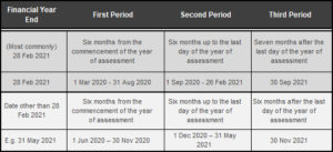 Two provisional tax payments are compulsory each year, one six months into the year of assessment (first period) and one on or before the end of the year of assessment (second period). There is also an option to make an additional third or top-up payment, seven months after the end of the year of assessment – unless your year end is anything other than end of February in which event you have only six months for the top-up payment (third period).